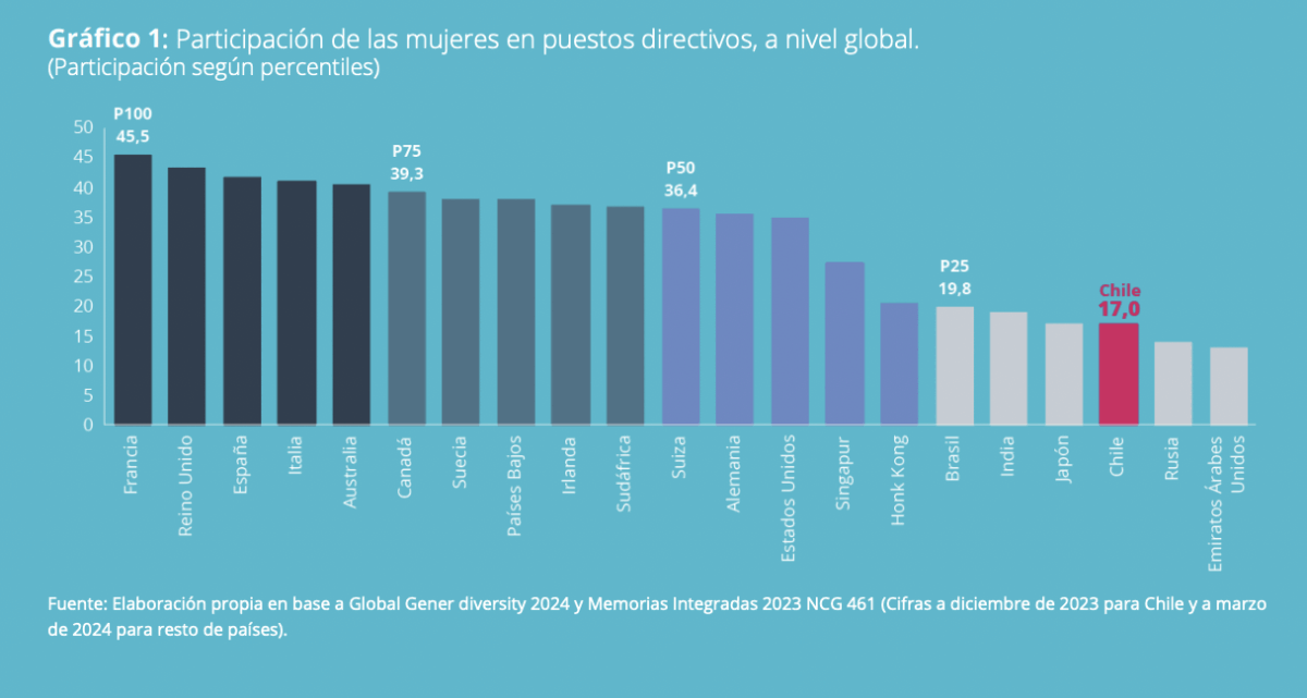 El Informe de Equidad Empresarial y Buen Gobierno Corporativo, elaborado por ChileMujeres y el Instituto de Directores de Chile, reveló que solo el 18,2% de los cargos titulares de directorios están ocupados por mujeres, lo que representa una brecha de 63,6 puntos porcentuales respecto de los hombres. En posiciones ejecutivas, la participación femenina alcanza el 30,2% en gerencias y el 18,5% en alta gerencia.