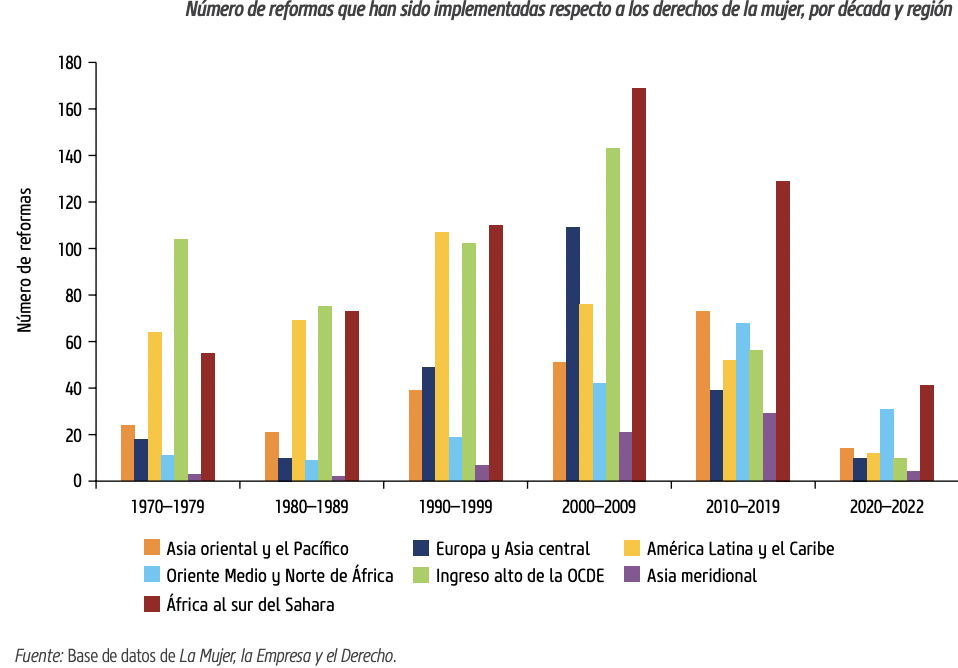 Casi 2.400 millones de mujeres en edad de trabajar, en el mundo, no tienen los mismos derechos que los hombres. El informe La mujer, la empresa y el derecho 2023 del Banco Mundial advierte que el ritmo de las reformas para garantizar la igualdad ha caído al nivel más bajo en 20 años. Al ritmo actual de reforma, las mujeres que ingresan a la fuerza laboral hoy se retirarán antes de equiparar beneficios.