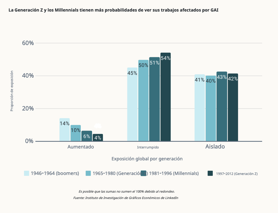 2.- IAG por educación, generación y género: Perspectivas del Instituto de Investigación de Gráficos Económicos de LinkedIn sugieren que más de la mitad de los miembros de la red tienen labores que pueden verse alteradas o aumentadas por la IA y que cambiarán hasta en 65% para 2030. Es más, los profesionales con títulos avanzados, la Generación Z y las mujeres verán que sus trabajos cambian más rápido que otros profesionales. Advierte que tiene el potencial de ayudar a restablecer y reconstruir los sistemas en la educación y el empleo, para que los trabajadores estén preparados de manera más equitativa para la fuerza laboral.