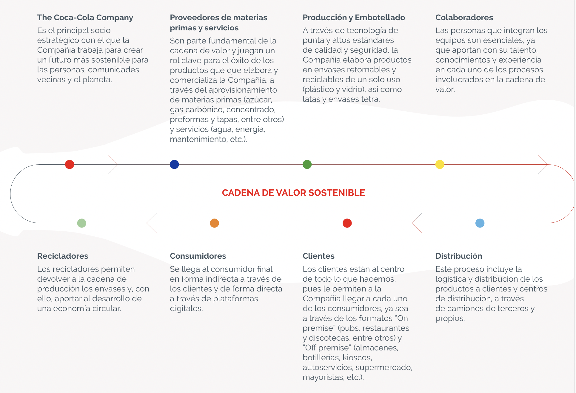 La retornabilidad, la recolección, el reciclaje y la reducción son aspectos claves en la operación de la compañía para avanzar en el cuidado del medio ambiente. En 2023, alcanzaron niveles de retornabilidad de bebidas gaseosas del 40% en Chile. En su Memoria Integrada, la empresa destaca el trabajo de generación de valor compartido con las comunidades, donde han implementado proyectos de gestión de agua y de economía local, entre otros.