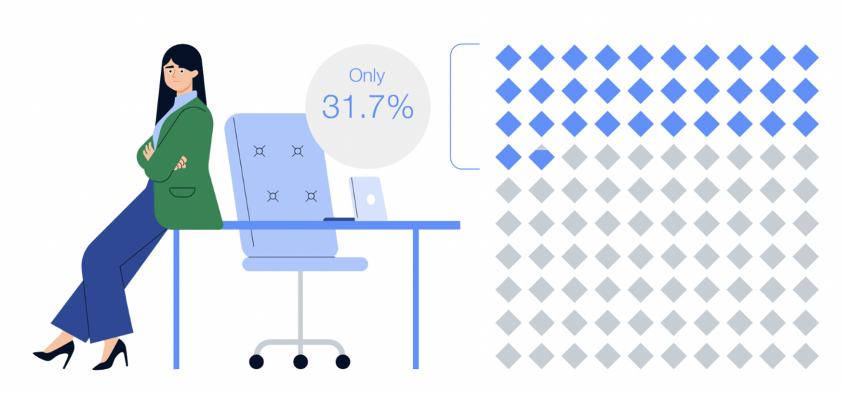 Las mujeres representan el 42% de la fuerza laboral, pero el 31,7% de los altos cargos. Fuente: Informe Global sobre la Brecha de Género 2024/LinkedIn Economic Graph