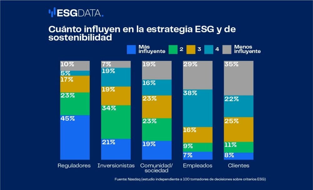Los reguladores son los que más injerencia tienen en el trabajo ESG de las empresas, un 45%. Los empleados figuran en segundo lugar con un 38% de las respuestas y los inversionistas con un 34%.