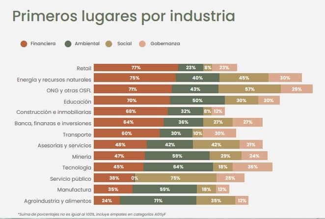 Destaca la presencia de proyectos en temas de gobernanza en los primeros lugares, tales como canales de denuncia, código de ética y políticas de compliance. En promedio, 52% de las empresas tienen iniciativas relacionadas con gobernanza, 42% sociales y 34% ambientales.